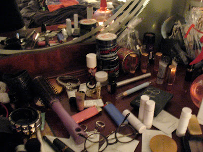 As I said below, I'm reviewing some makeup for my friend Laurie's blog; beautysspot. In keeping with the fact that I'm doing that, writing 2 blogs, (cheetahsvintage.blogspot.com), running an online boutique, painting, and a bunch of other shit, my house is like a total disaster. However, some of it is really nice to look at even when it's an avalanche of work. Here's a few shots from my workspace.